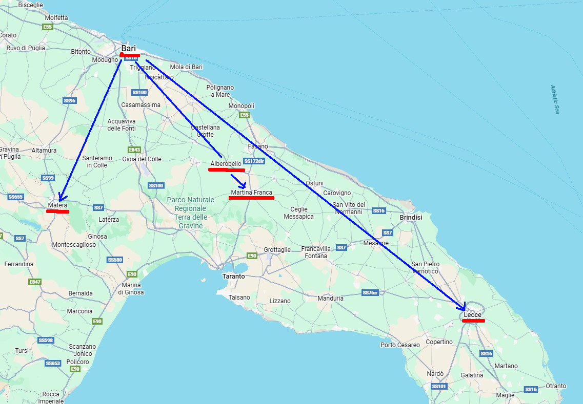 Utána jött a város kiválasztás, hol is lakjunk. A gép Bariban szállt le. Sokáig nézegettem a városokat, látnivalókat hogy mi fér bele ebbe 5-6 napba. Megvoltak a helyek, autót nem akartam bérelni – macerás hogy hol hagyjuk – a vonat és buszközlekedés meg elég jó arra, így Bariban a vasútállomáshoz közel foglaltam szállást. Igen, a Fireflies-nál megint, mint már majdnem 14 éve mindig. Ez nem is kérdés.